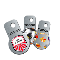 Unsere Einkaufswagenlöser können entweder mit einer Lasergravur oder einer Beschichtung aus Kunstharz (Doming) versehen werden. Je nach Untermaterial sind die Gravuren auch hier silbern bis schwarz gefärbt. Beim Doming mittels Kunstharz wird Ihre Werbebotschaft im Digitaldruck mit bis zu vier Farben auf eine Folie aufgebracht. Dabei sind auch hochwertige und fotorealistische Motive möglich. Anschließend wird eine nach oben gewölbte, dreidimensionale Oberflächenbeschichtung aus Epoxidharz auf den Einkaufswagenlöser aufgebracht, wodurch das Druckmotiv effektvoll verstärkt wird. Einkaufswagenlöser mit Firmenname werden so nicht nur gut gegen Abnutzung geschützt, die Druckqualität Ihres Firmeneindrucks kann mit dem Digitaldruck sehr gut umgesetzt werden.