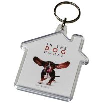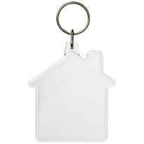 Transparenter Schlüsselanhänger in Hausform mit metallenem Schlüsselring. Der Metallring bietet ein flaches Profil, das sich ideal für Mailings eignet. Abmessungen der Druckeinlage: 5,9 cm x 5,6 cm.