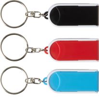 Schlüsselanhänger aus Kunststoff, mit LED-Lampe (weiß), Flaschenöffner aus Metall, Maßband (Länge ca. 1 m) und Metall-Schlüsselkette.