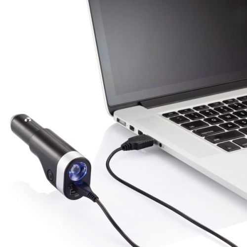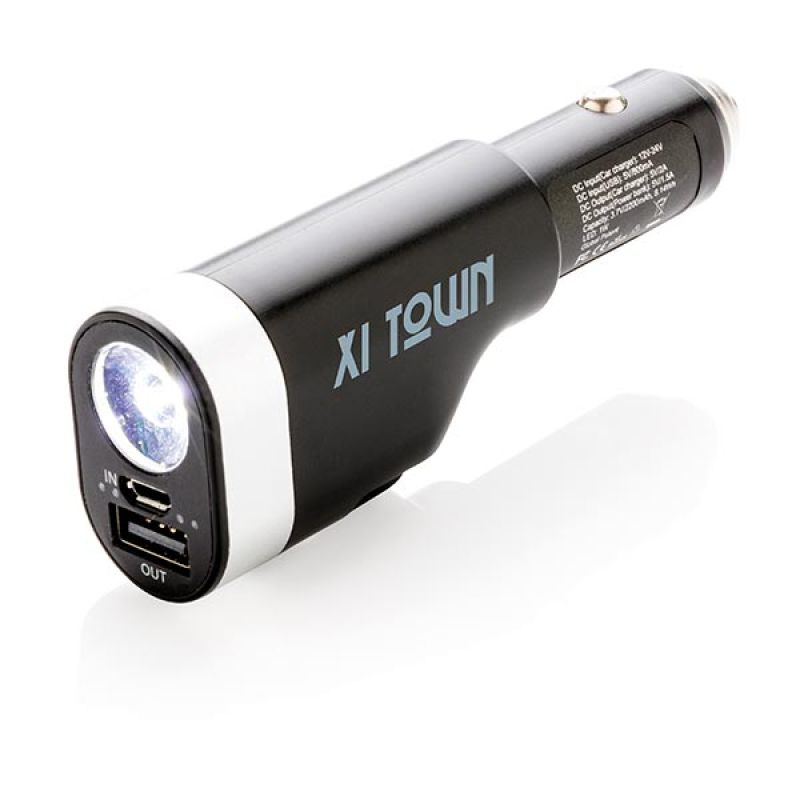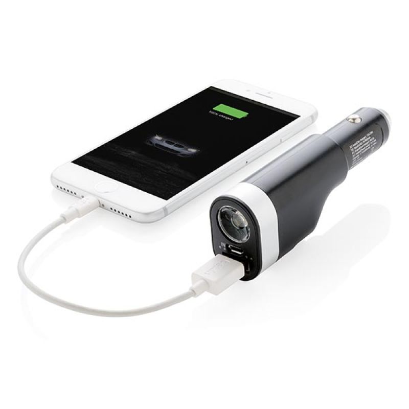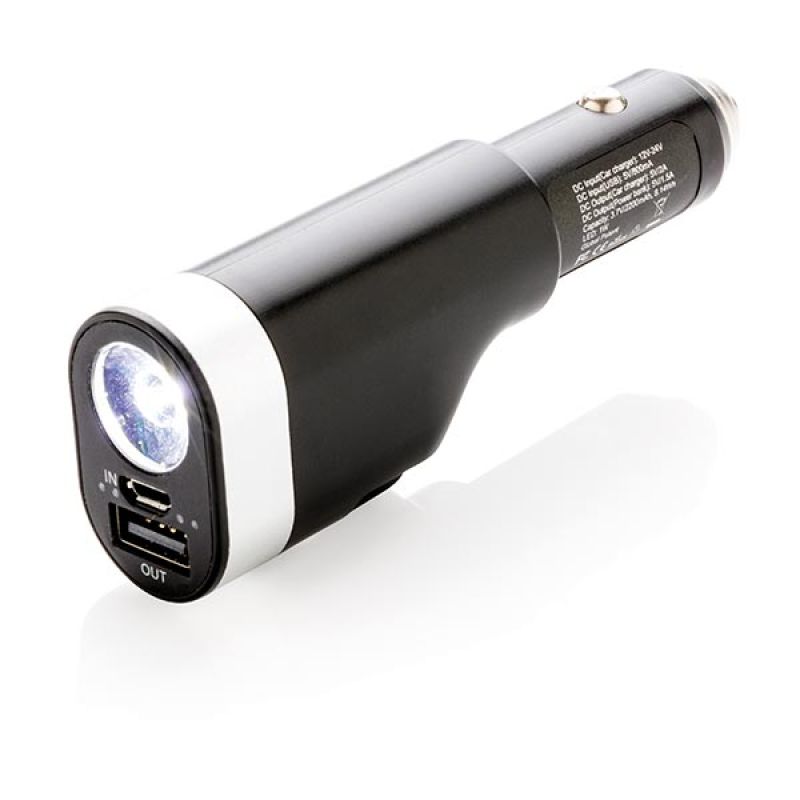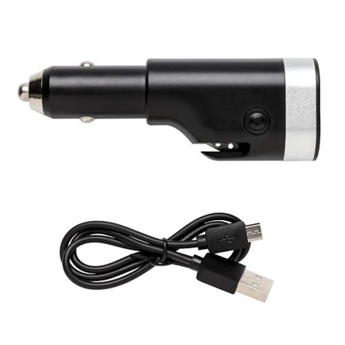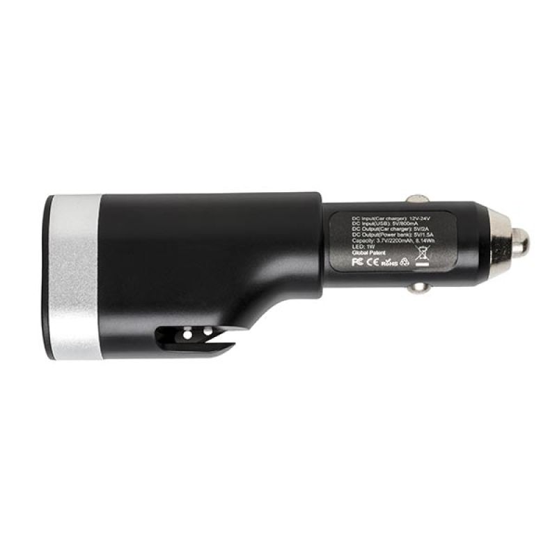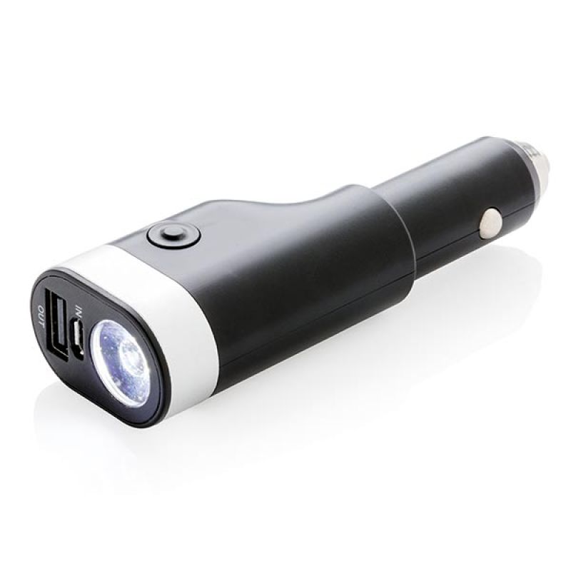 Werbeartikel Beschreibung: 6-in-1 Auto Notfallset, inkl. 2.200mAh Powerbank, USB Auto Ladegerät, Gurtschneider, Notfallhammer, LED Taschenlampe und rot-blinkendem Notfalllicht. Die Powerbank kann sowohl über den Zigarettenanzünder, als auch über USB Ladegerät aufgeladen werden. Input 12V-24V, Output 5V/1A.