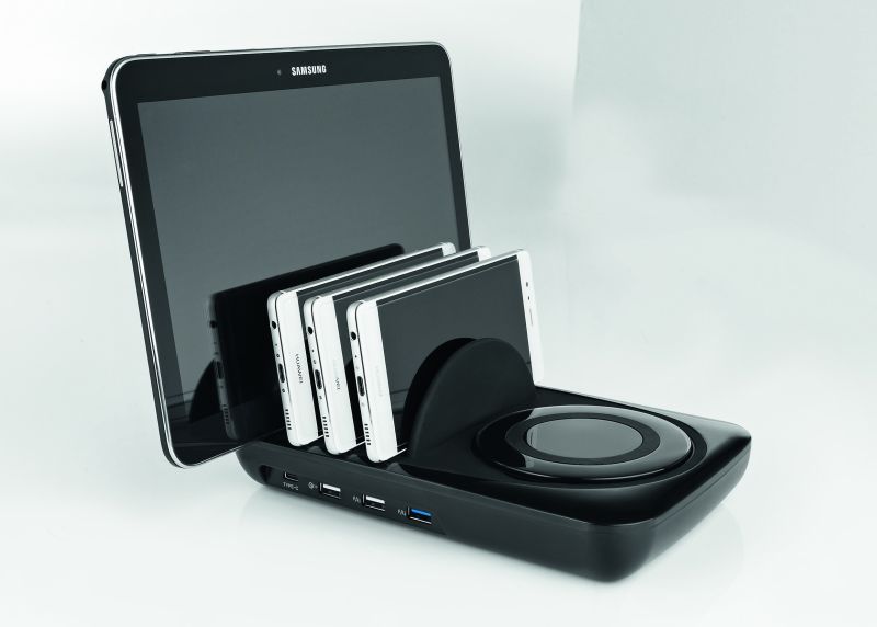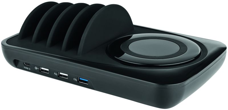 Werbeartikel Beschreibung: Ultramodernes Charge-Center für bis zu 5 Geräte mit integriertem, aber entnehmbaren Wireless Charger. 35Watt total, 5Watt wireless, Smart Charge, Output: Wireless 2,4 A, USB Ports 2,4 A, USB-C Port 2,4 A, VPE 24. 3 USB Anschlüsse, 1 USB-C Anschluss und ein Netzkabel, Designkarton