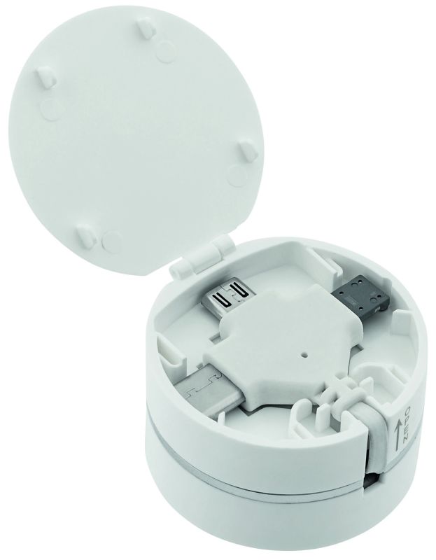 Werbeartikel Beschreibung: Universelles Ladekabel, praktisch aufgerollt im Mini-Container. VPE 200. 3 Adapter: Micro USB, Lightning®, USB-C; Designkarton