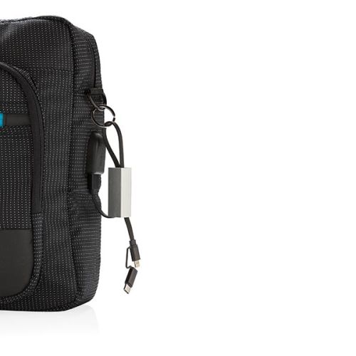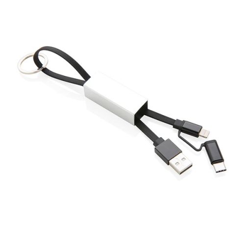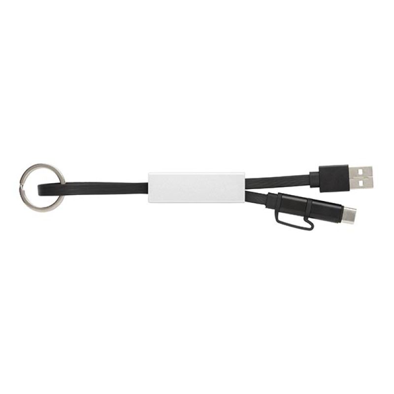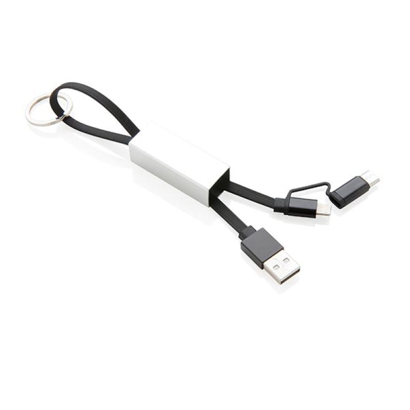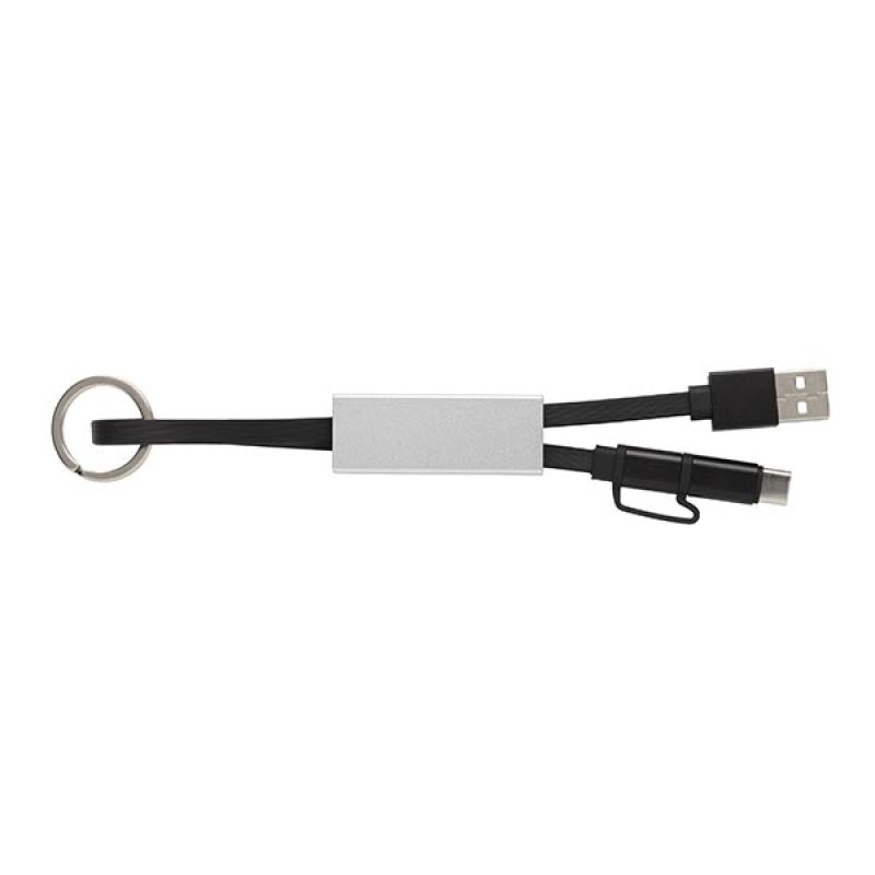 Werbeartikel Beschreibung: Modernes 3-in-1 Ladekabel mit Type-C USB und zweiseitigem Anschlußstecker für iOS und Android Geräte die einen Micro-USB Anschluß benötigen. Die Kabel aus TPU, das Schutz-Case aus Aluminium. Mit Schlüsselring. Nicht nur Ladekabel, sondern auch zur Synchronisation Ihrer Daten geeignet. Länge: 15cm
