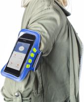 Smartphonehülle aus Neopren und PU mit drei LED-Leuchten rechts und links vom Sichtfenster, sowie einem Klettverschluss. Die Schutzhülle ist passend für Smartphones mit einer Breite von max. 7 cm.