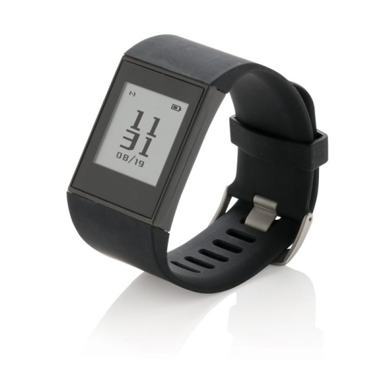 Werbeartikel Beschreibung: "State-of-the-Art E-ink Sportuhr für 24 verschiedene Aktivitäten; Tennis, Walking, Basketball, Biken und vieles mehr. Mit 1,28” Sicherheitsglass und Touchscreen für eine lange Lebensdauer. Das Display ist selbst bei starker Sonneneinstrahlung gut ablesbar. Inkl. dynamischem Pulsmesser. BT 4.0 für eine stabile Verbindung und IP67 wasserdicht. Zeigt eingehende SMS, Skype, WhatsApp und Twitter-Nachrichten. Die kostenlose App ist kompatibel ab iOS 8.1 und Android 4.4."