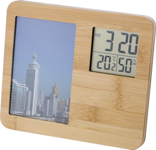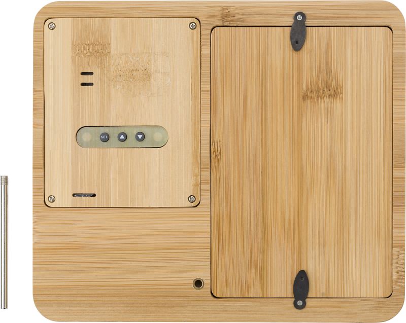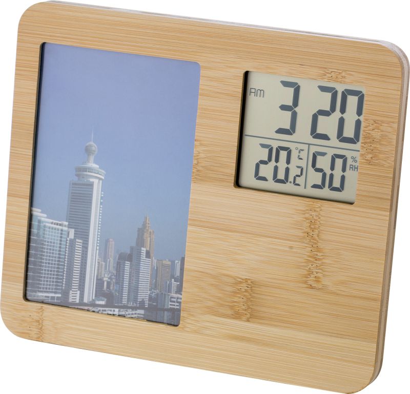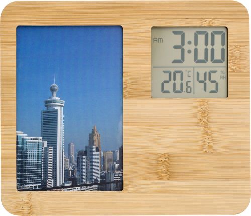 Werbeartikel Beschreibung: Wetterstation aus Bambus mit Fotorahmen. Funktionen: Uhr, Temperatur und Luftfeuchtigkeit. Geeignet für Fotos im Format 9x14cm. Fotoformat 15 x 10 cm. Inklusive Batterien.
