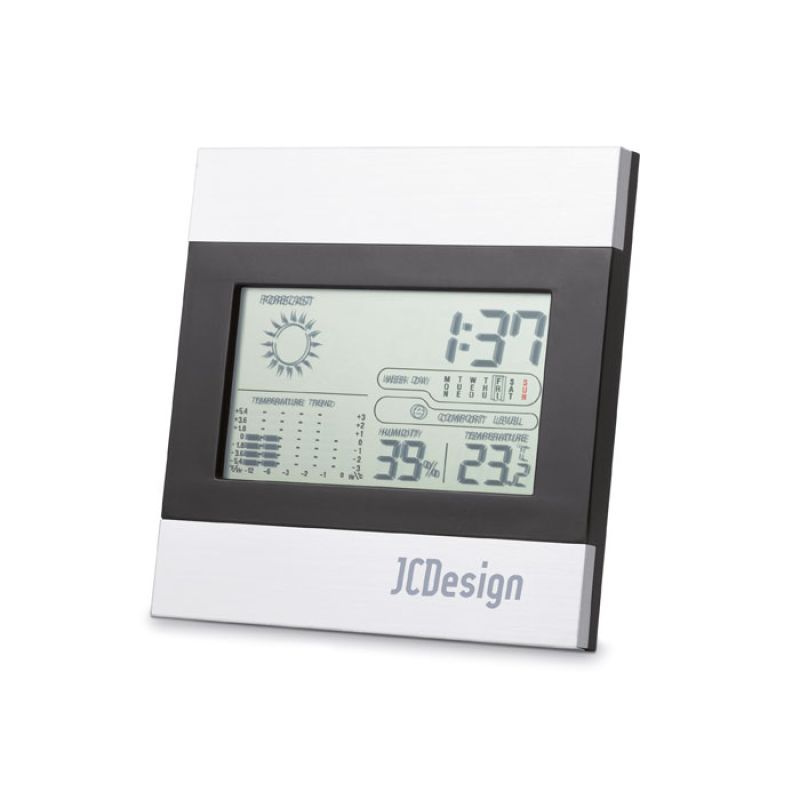 Werbeartikel Beschreibung: Diese stilvolle Wetterstation in schwarz und silber beinhaltet eine Uhr, Temperatur- und Luftfeuchtigkeitsanzeige und einen Kalender. Exklusive 2 AAA Batterien.