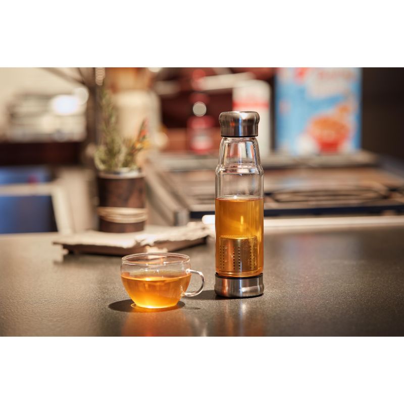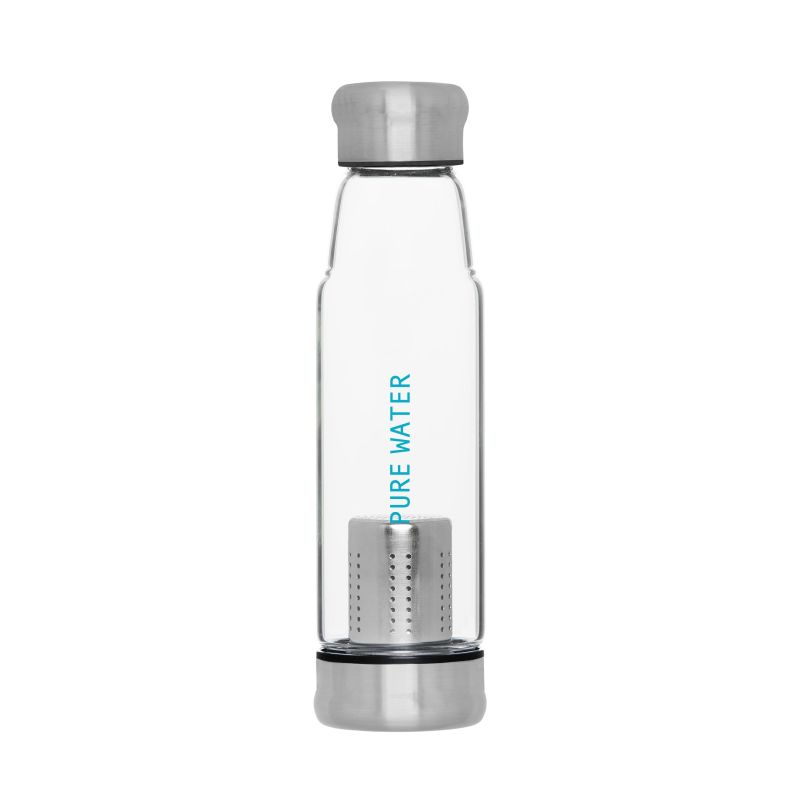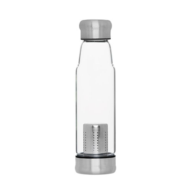 Werbeartikel Beschreibung: Für Getränke mit Geschmack. Schicke Glasflasche aus Borosilikat-Glas mit Schraubverschluss aus Edelstahl inkl. Silikondichtung. Die griffige, graue Synthesekautschukhülle mit Halteschlaufe hält die Temperatur der Getränke länger konstant. Zudem schützt sie die Hände bei heißen Getränken vor dem warmen Glas. Der Siebbehälter für Tee oder Früchte am Boden ist per Schraubverschluss sicher mit der Flasche verbunden. Füllmenge: 0,5 Liter.
