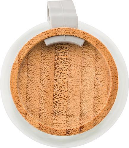 Werbeartikel Beschreibung: Trinkflasche aus Glas (500 ml) mit Drehverschluss aus Bambus und Silikonband.