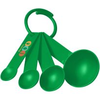 4-teiliges Grillset bestehend aus einer grünen Schürze mit weißem Fußballfeld-Aufdruck, einer Fleischgabel, einem Wender und einer Zange aus Aluminium mit Holzgriffen und Fußball-Stanzung.