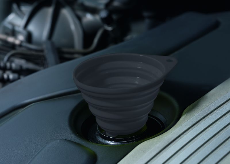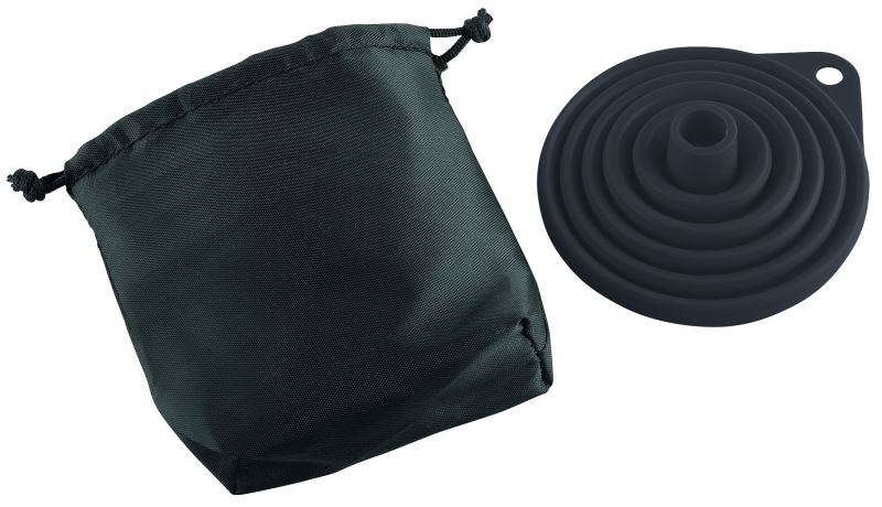 Werbeartikel Beschreibung: Faltbarer Silikontrichter, ideal zum Einfüllen von Wischwasser ODER Öl. VPE 100. Auslaufhemmendes Nylonsäckchen, Zuziehkordel