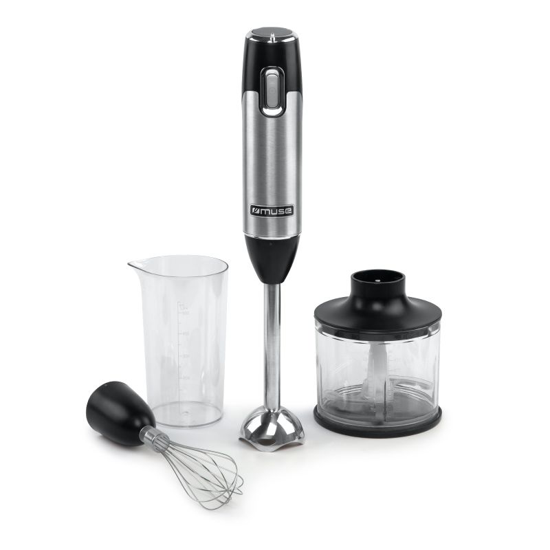 Zerkleinern, Schlagen, Mixen und Pürieren. Dieses 4-teilige Stabmixer-Set von Muse hat alles, was Sie brauchen, um schnell und einfach die leckersten Gerichte zuzubereiten. Dieser 600 W starke Stabmixer ist mit Edelstahlklingen ausgestattet und eignet sich zusammen mit dem Zerkleinerer und dem Messbecher für die Zubereitung von Saucen, Suppen und kleinen Gerichten.