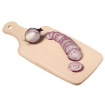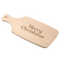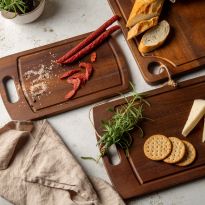 Servierbrett aus Akazienholz mit Griff. Aufhänger aus PU. Holz ist ein natürliches Produkt, es kann daher zu leichten Abweichungen in Farbe, Dekor und Maßen kommen.