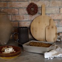 Schneidebrett aus Bambus, das nach nachhaltigen Standards bezogen und produziert wird. Das Brett kann auch zum Servieren von Tapas verwendet werden.