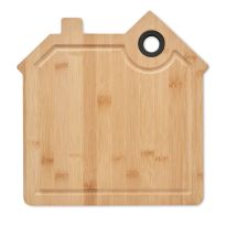 Schneidebrett aus Bambus mit Saftrille. In Optik eines Hauses. Inkl. Aussparung zum praktischen Aufhängen. Bambus ist ein natürliches Produkt, es kann daher zu leichten Abweichungen in Farbe, Dekor und Maßen kommen.