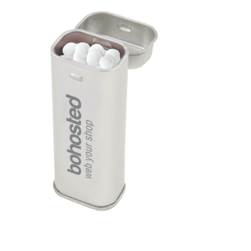 Werbeartikel Beschreibung: Hohe Metallklappdeckeldose 30x20x80 mm mit ca. 28 gr. Pfefferminzpastillen. Ihre Werbung drucken wir mittel Tampondruck von 1 bis 4 farbig auf der Vorder oder Rückseite in einer Größe von maximal 70 x 15 mm oder auf der Seite in einer Größe von maximal 50 x 16 mm. Diese Pfefferminzdose ist befüllt mit Pfefferminzdragees mit feinstem erfrischendem Minzgeschmack. Sie können nach Belieben den Geschmack der Minzdragees selbst wählen und konfigurieren. Wählen Sie zwischen den Sorten süßer Pfefferminzgeschmack (gesüßt mit Dextrose) oder erfrischender Minzgeschmack zuckerfrei. Unsere Pfefferminzdosen mit Ihrem Logo haben auf der Unterseite der Mintboxen einen Zutatenaufkleber. Auf diesem sind sämtliche vorgeschriebene Inhaltsangaben enthalten. Alle Pfefferminzbonbons haben eine Mindesthalbarkeit von 12-18 Monaten bei sachgerechter Lagerung. Die frischen Minzpastillen sind am Rand mit einer Folie verschweißt. So erhält der Kunde einen sicheren Erstzugriff.