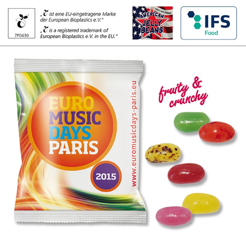 Werbeartikel Beschreibung: American Jelly Beans / Preise pro Stück inkl. Werbeaufdruck 1-farbig zzgl. Nebenkosten. Allgemeine Süßigkeiten-Beschreibung: Füllung: American Jelly Beans, Haltbarkeit ca. 6 Monate bei sachgerechter Lagerung- American Jelly Beans für Ihre Süße Werbung mit Geschmack.