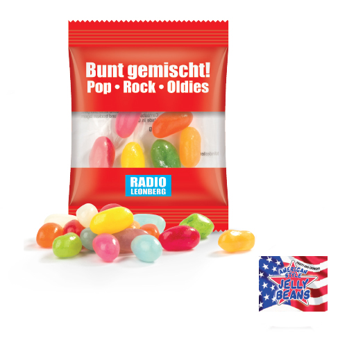 Werbeartikel Beschreibung: Produkt: Tüte aus weißer Folie, individuell bedrucktInhalt: Jelly Beans der Marke American Style, bunt gemischt, ca. 10 gHaltbarkeit: 12 Monate Preise: € / Tüte inkl. 4-c Digitaldruck zzgl. Drucknebenkosten.
