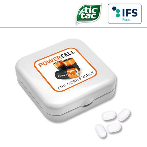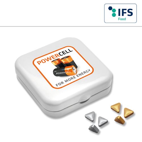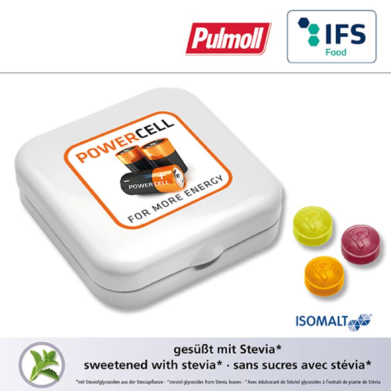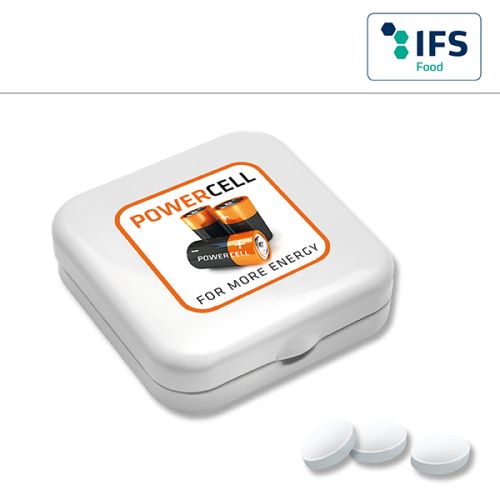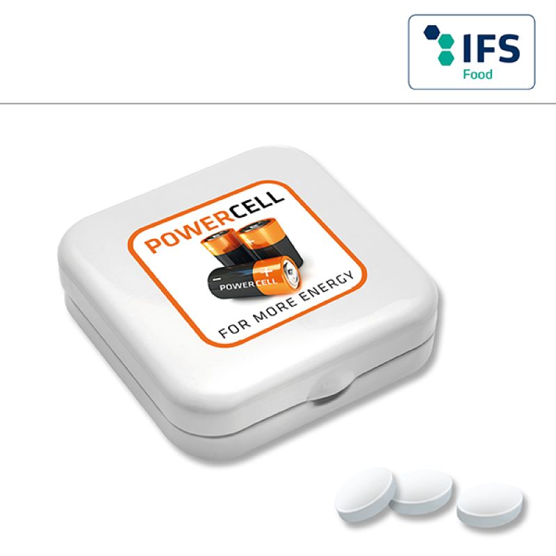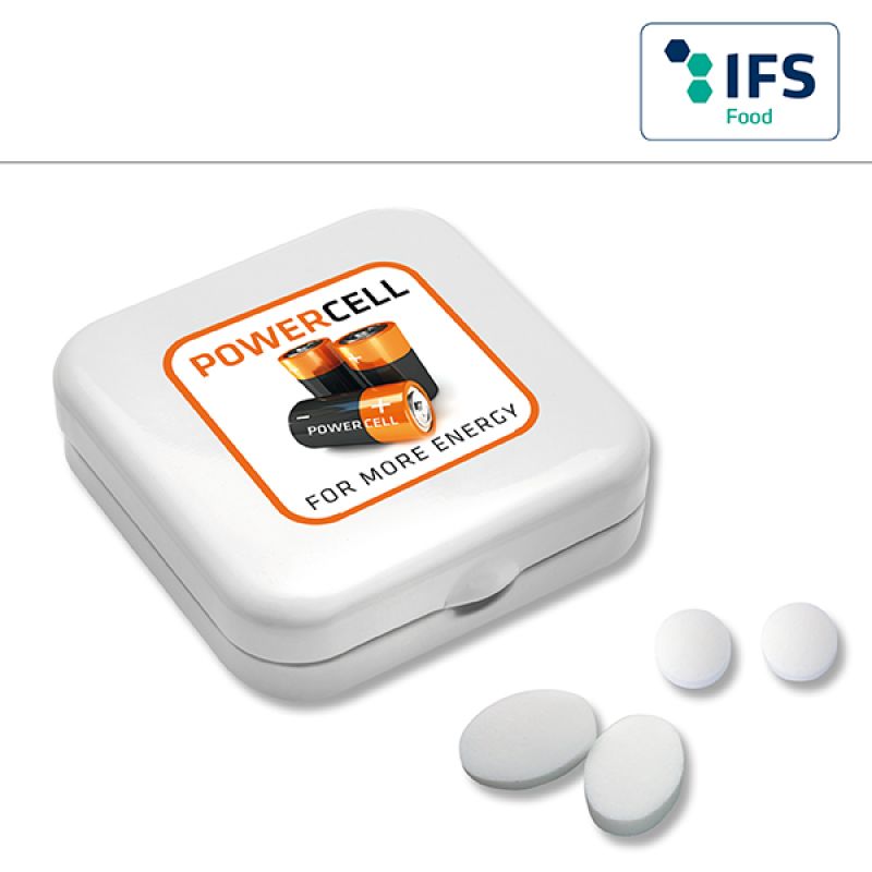 Werbeartikel Beschreibung: Quadro-Dose mit Pfefferminzpastillen / Preise pro Stück inkl. Werbeaufdruck 1-farbig zzgl. Nebenkosten. Allgemeine Süßigkeiten-Beschreibung: Füllung: Zuckerfreie Pfefferminzpastillen rund ø 9 mm | Zuckerfreie Pfefferminzpastillen oval 19 x 13 mm, Haltbarkeit ca. 18 Monate bei sachgerechter Lagerung- Quadro-Dose mit Pfefferminzpastillen für Ihre Süße Werbung mit Geschmack.