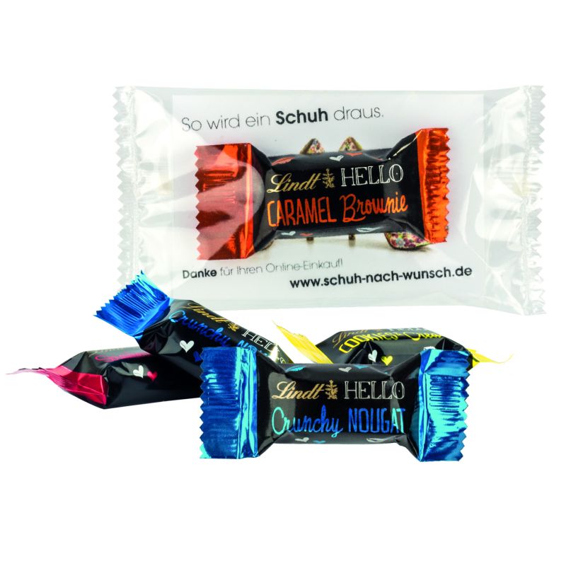 Werbeartikel Beschreibung: Produkt: Lindt Hello Mini Stick, einzeln verpackt in transparenter Folie mit eingeschobener Werbekarte, individuell bedrucktInhalt: Ein Lindt Hello Mini Stick – Vollmilchschokolade mit verschiedenen Füllungen (bunt gemischt)Haltbarkeit: 9 MonatePreise: € / Stück inkl. 4-c Digitaldruck zzgl. Drucknebenkosten.