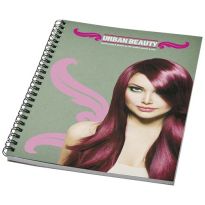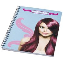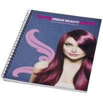 Dieses A5 Notizbuch enthält einen weißen oder schwarzen Draht, 80 g/m2 Blankopapier und eine glänzende Vorder- und Rückseite aus Karton (250 g/m2). Das Standardmodell wird mit 50 Blatt geliefert, aber das Notizbuch ist auch mit 80 Blatt erhältlich. Bedruckung ist sowohl auf den Blättern als auch auf der Vorder- und Rückseite möglich.