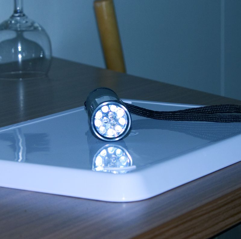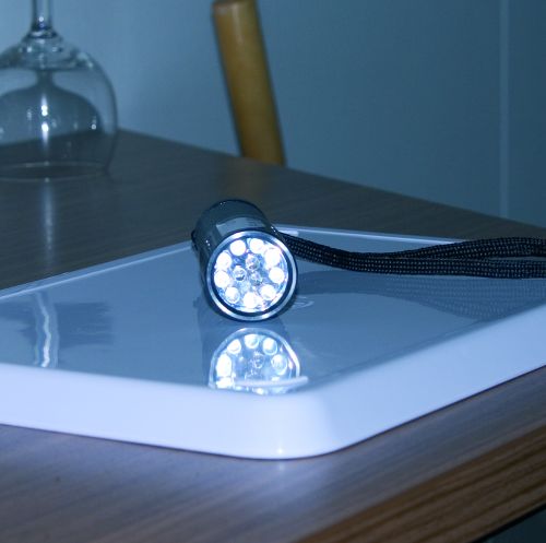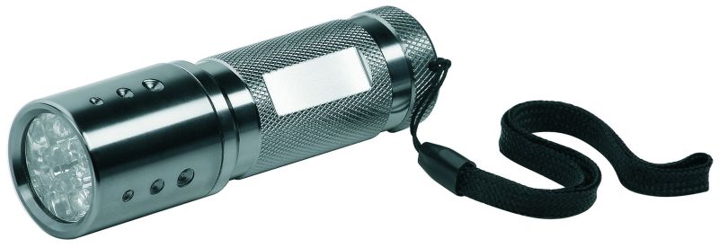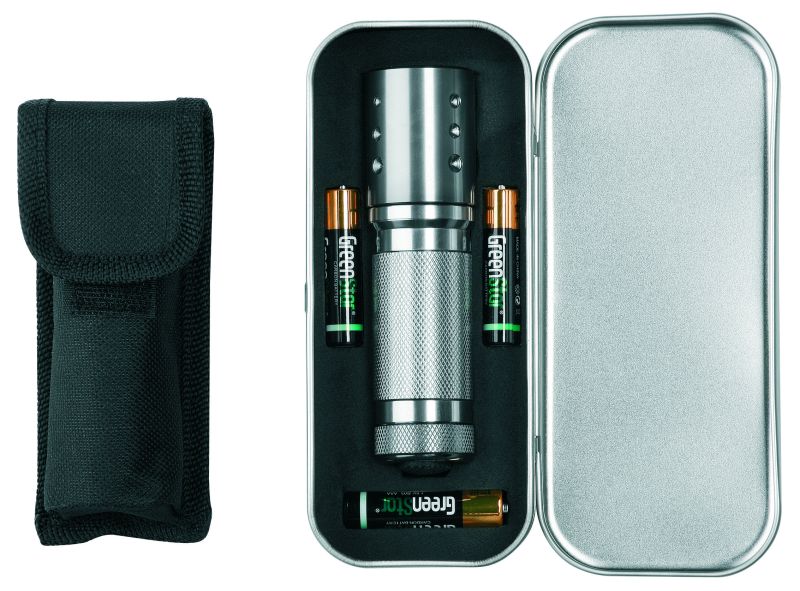 Werbeartikel Beschreibung: Lichtstarke 12 Classic-Power-LED-Lampe mit 3 Lichtmodi: hell weiß, rot blinkend, SOS-blinkend. Spritzwasser- und überspannungsgeschützt, VPE 60. Gürteletui, 3 AAA Batterien, Blechschatulle, Designkarton