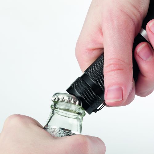 Werbeartikel Beschreibung: Günstige Hochleistungstaschenlampe mit integriertem Kapselheber im Knopfbereich und fokussierter Marken LED. 3Watt, Spritzwasser- und überspannungsgeschützt, VPE 60. Kapselheber, Gürteletui, 3 AAA Batterien, Designkarton