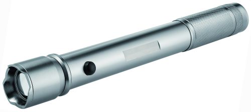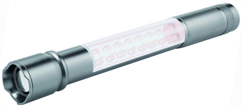 Werbeartikel Beschreibung: Worklight mit fokussierbarer Hochleistungs-LED, ultrahelles Arbeitslicht an der Seite und rot-blinkenden LEDs als Signalleuchte. 3Watt, COB Technologie, spritzwasser-/ überspannungsgeschützt, VPE 40. Nothammer, Magnet, 3 AAA Batterien, Designkarton