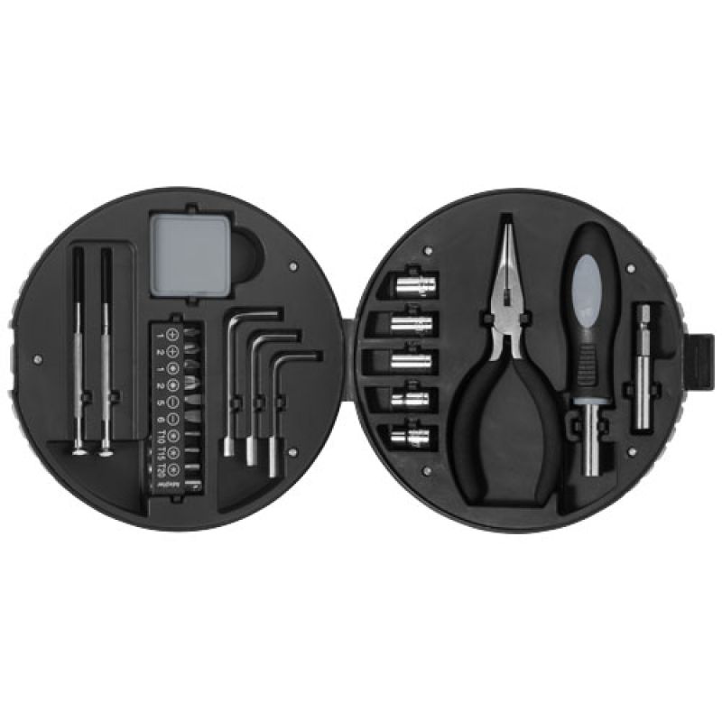 Werbeartikel Beschreibung: 25 teiliges Werkzeugset beinhaltet ein Mini-Maßband, einen Kreuzschlitzschraubendreher, einen Flachschraubendreher, 9 Bits mit Adapter (4 Kreuzschlitz, 2 Flachkopf und 3 Sechskant), 3 Sechskantschlüssel, 5 Steckschlüsseleinsätze (5 bis 9 mm), Nadelzange, Schraubendrehergriff und Adapter für Bits und eine praktischer Kasten. Verpackt in einem STAC Geschenkkarton. Exklusives Design.