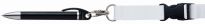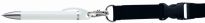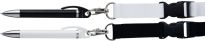 Drehkugelschreiber mit schwerer, matt verchromter Metallspitze und Zierring. Schaft und Clip uni gedeckt schwarz oder weiß. An einem Lanyard (Umhängeband) mit Metallkarabinerhaken und Sicherheitsverschluss, der sich beim Ziehen öffnet.