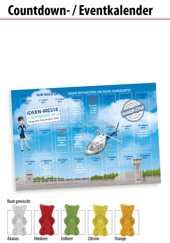 Werbeartikel Beschreibung: Ihr ausgewähler Artikel: Wand Countdown-/ Eventkalender mit Haribo Bärli / Preise pro Stück inkl. Offsetdruck 1-4 farbig zzgl. Nebenkosten. Allgemeine Süßigkeiten-Beschreibung: Inhalt: 1 Stück, Geschmack: 0, Mindestens haltbar bis: bei sachgerechter Lagerung 12 Monate - Wand Countdown-/ Eventkalender mit Haribo Bärli für Ihre Süße Werbung mit Geschmack.