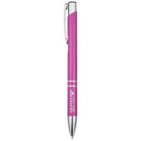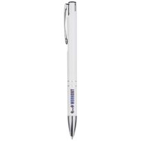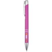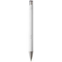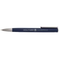 Drehkugelschreiber aus Metall mit farblich abgestimmten Touch-Pad, blau schreibender Mine und 8 Zierringen. Ihre Werbung wird rechts vom Clip per Lasergravur angebracht.
