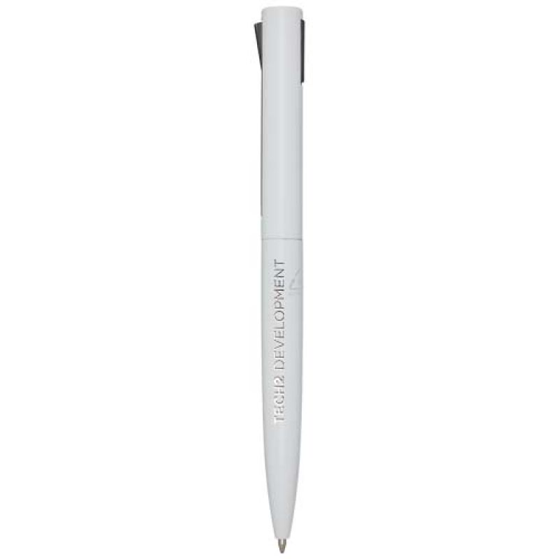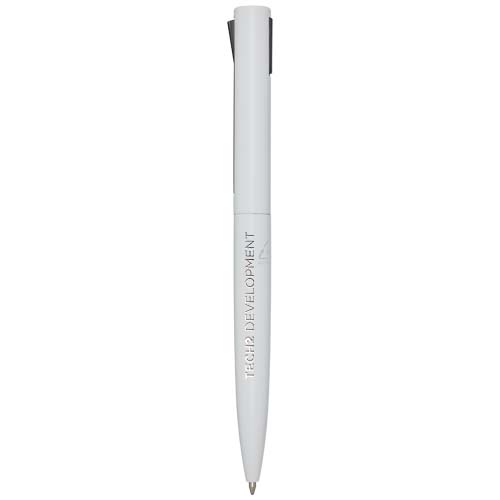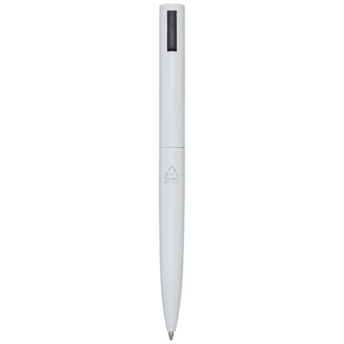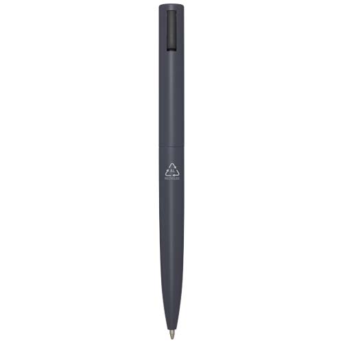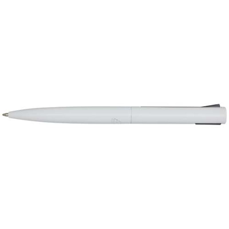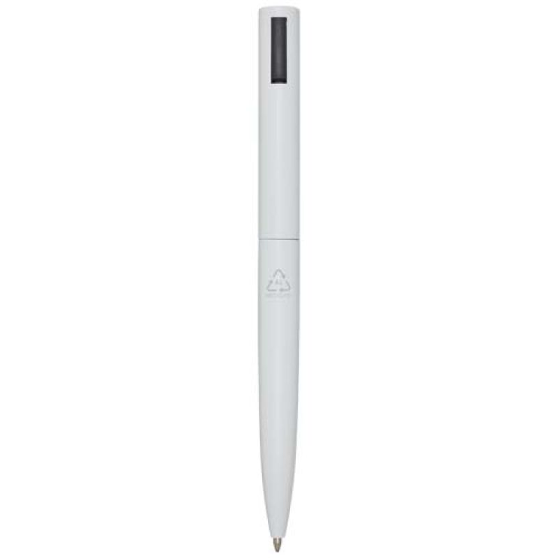 Werbeartikel Beschreibung: Kugelschreiber, dessen oberer Schaft aus recyceltem Kunststoff und dessen unterer Teil aus recyceltem Aluminium besteht. Der Clip besteht aus Eisen. Tintenfarbe: Schwarz. Schreiblänge: 1000 Meter. Strichstärke: 1,0 mm.