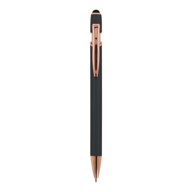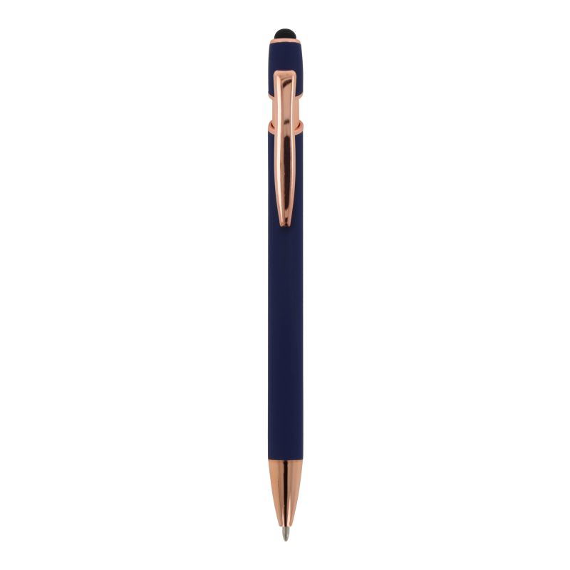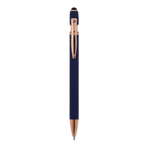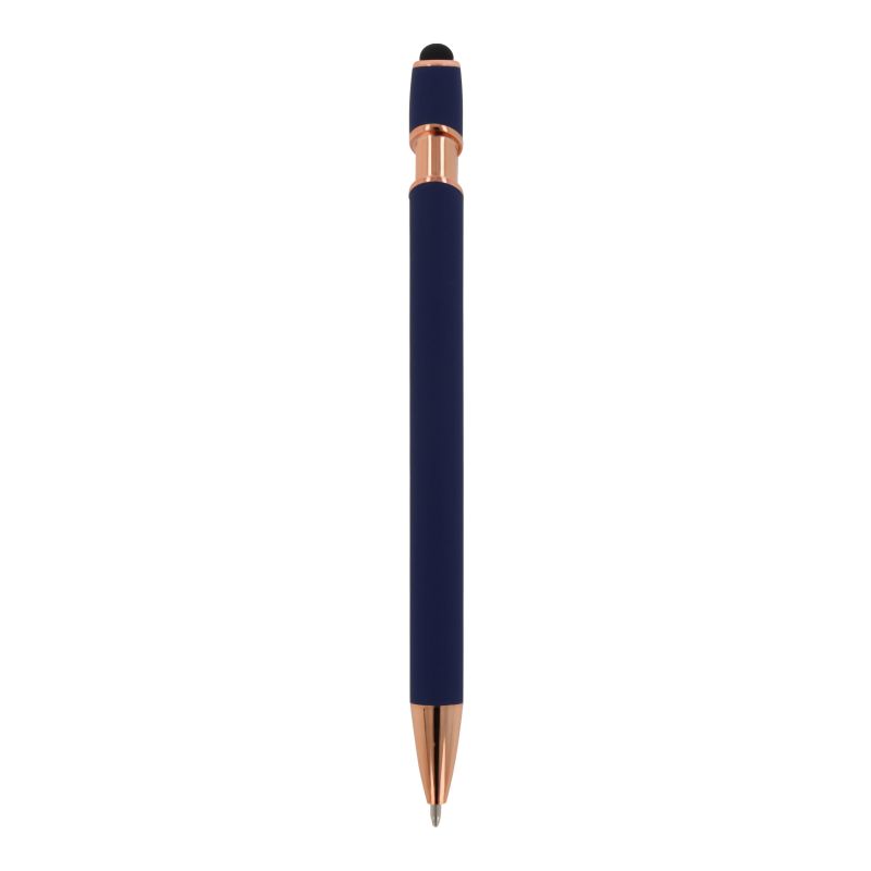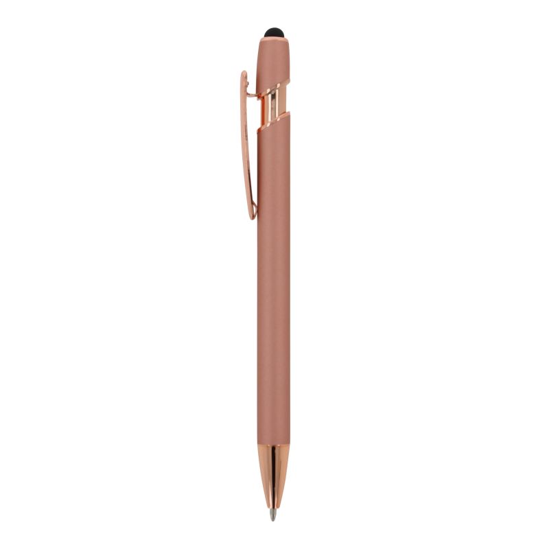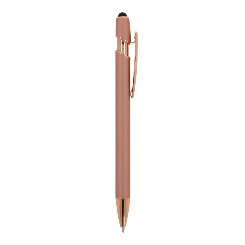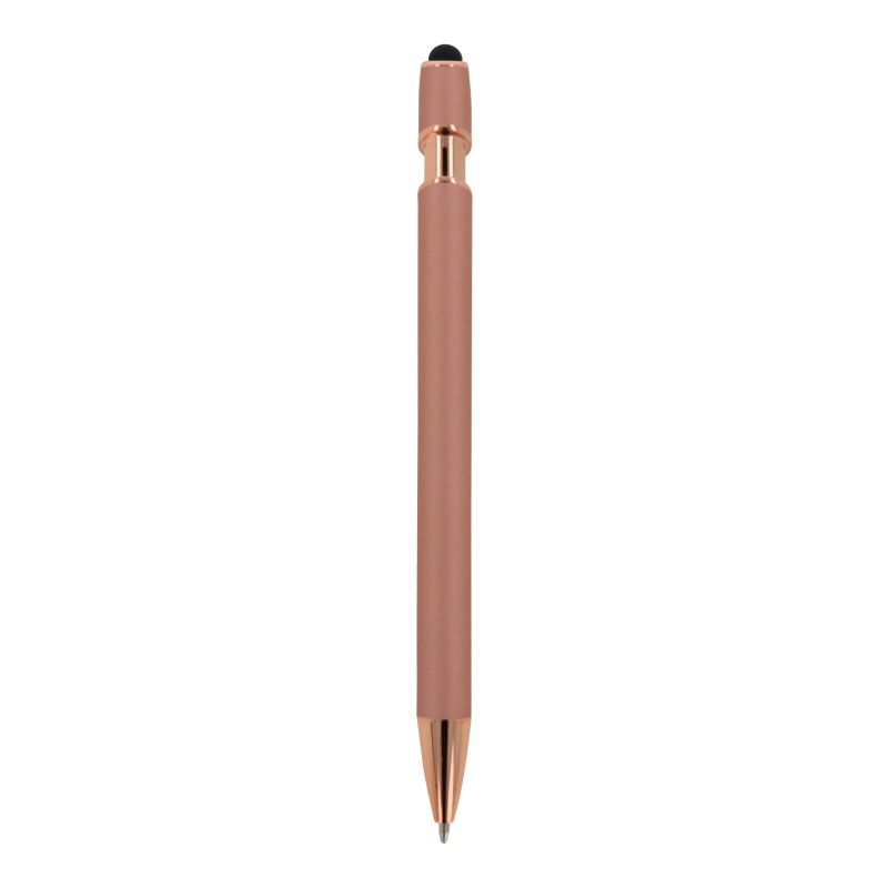 Kugelschreiber aus roségoldenem Aluminium mit eleganter Soft-Touch-Oberfläche und Stylus. Mit massivem Metallclip. Schreibfarbe: blau.