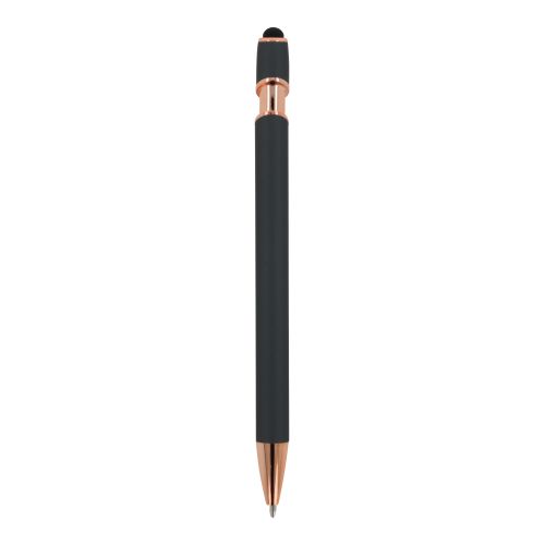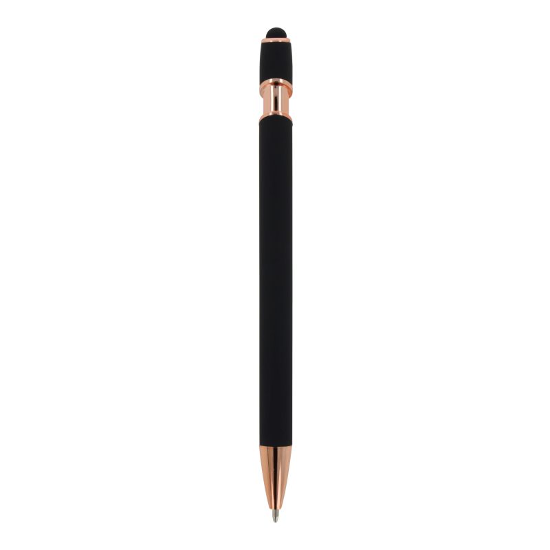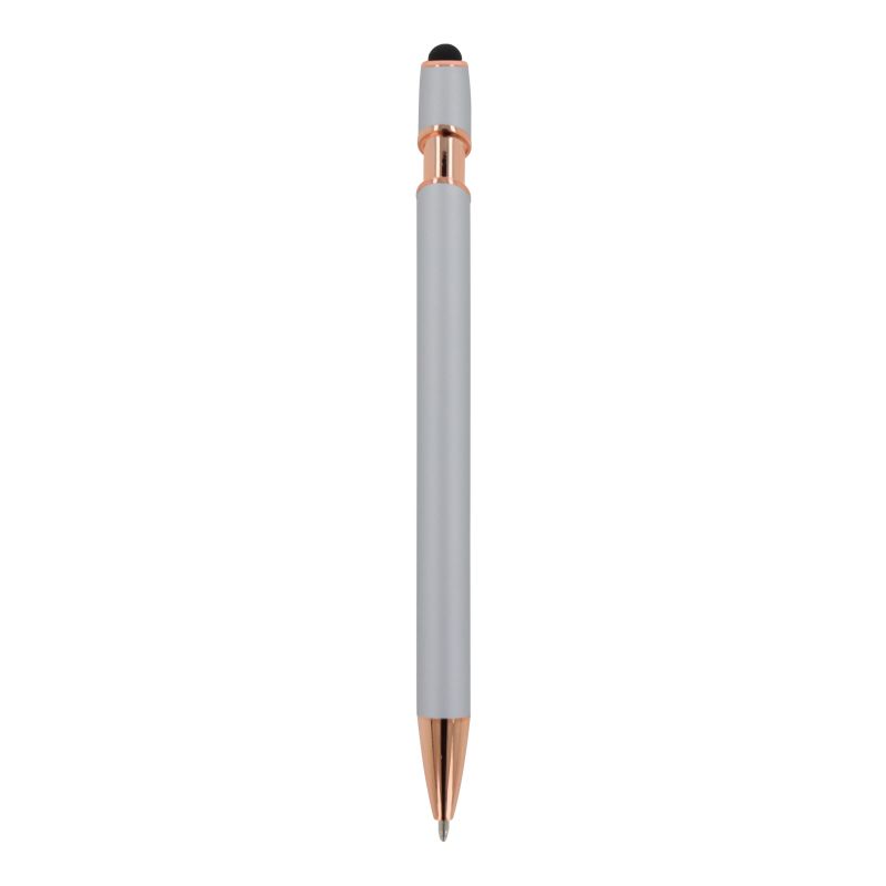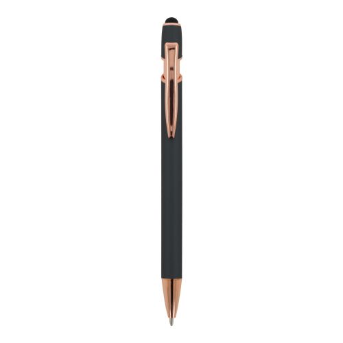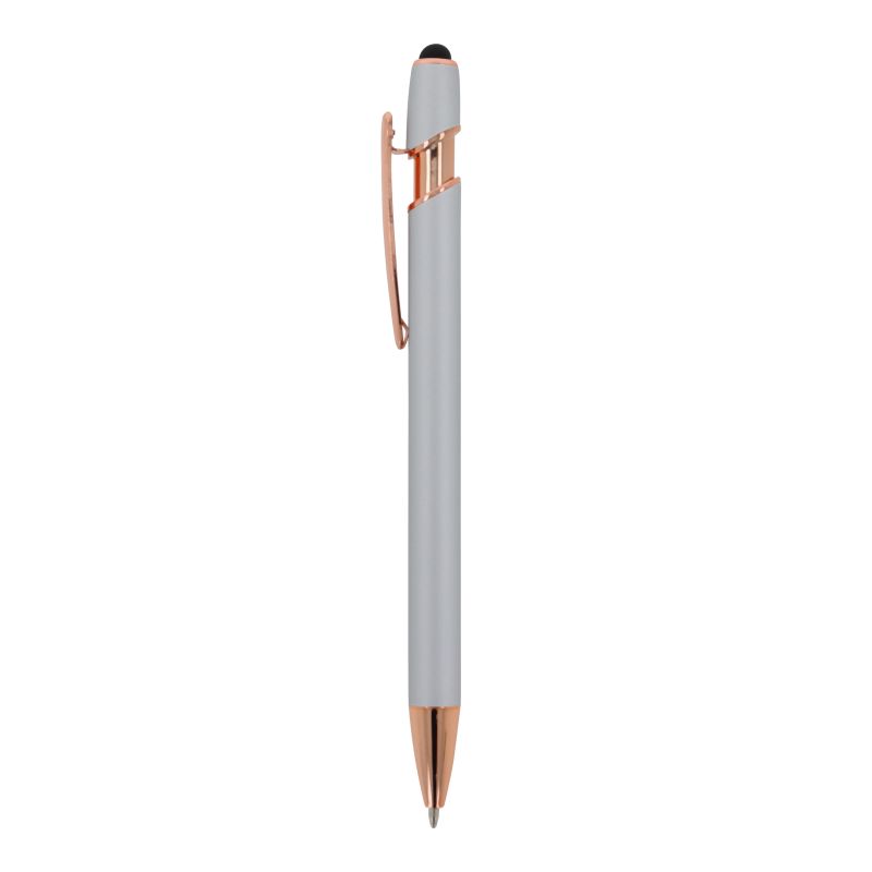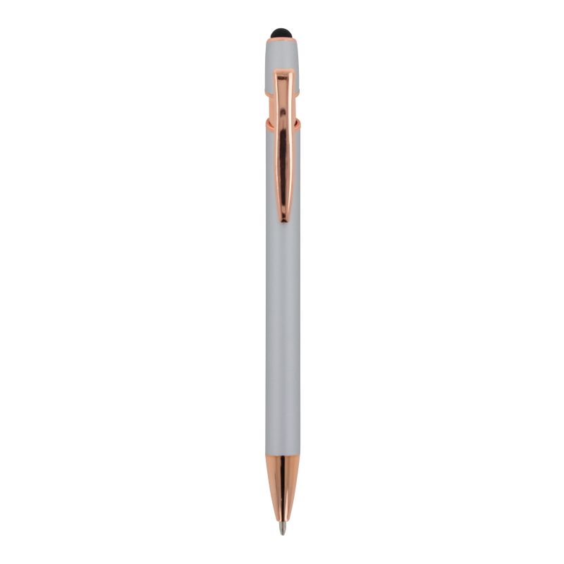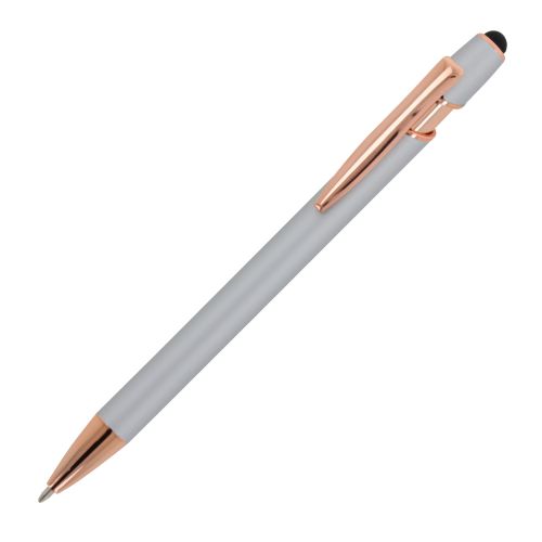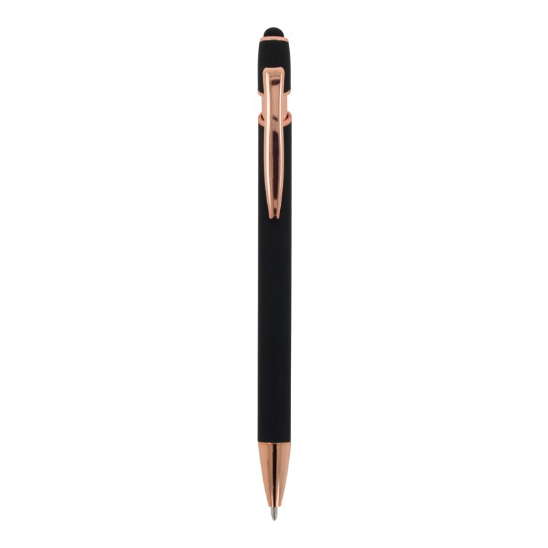 Kugelschreiber aus roségoldenem Aluminium mit eleganter Soft-Touch-Oberfläche und Stylus. Mit massivem Metallclip. Schreibfarbe: blau.