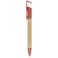 Bamboo-Kugelschreiber, der auch als Telefonhalterung fungiert. Der Knopf und der Mittelring bestehen aus recyceltem Kunststoff, die Spitze aus Messing und der Schaft aus nachhaltig angebautem Bambus. Tintenfarbe: Schwarz. Schreiblänge: 1000 Meter. Strichstärke: 1,0 mm.