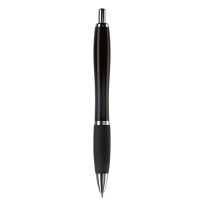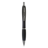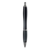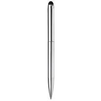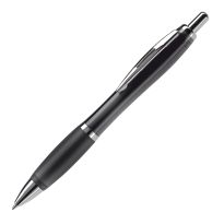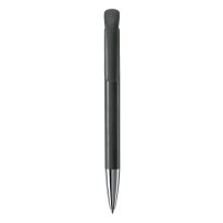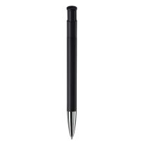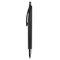 Eleganter Metall Kugelschreiber mit schwarzen Besätzen. Der Kugelschreiber wird gelasert und das Logo erscheint in der Farbe des Stylus Tip. Schriftfarbe: blau. Mechanismus: DruckmechanismusStandardschreibfarben: blauMinenart: Plastic giant refill