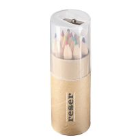 6 Farbstifte in zylinderförmigem Karton mit Spitzer im Kunststoffdeckel.