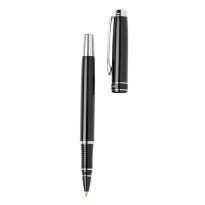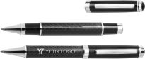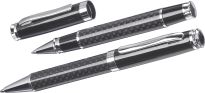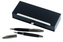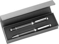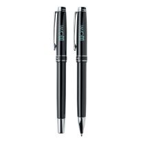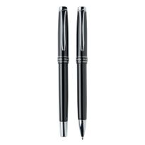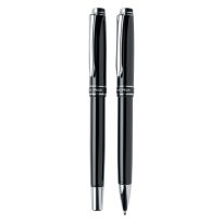 Schreibset ADORNO : bestehend aus Metall-Tintenroller (schwarzschreibend) mit Verschlusskappe und schwarzer Griffzone und Metall-Drehkugelschreiber (blauschreibend), Lieferung im passenden Etui