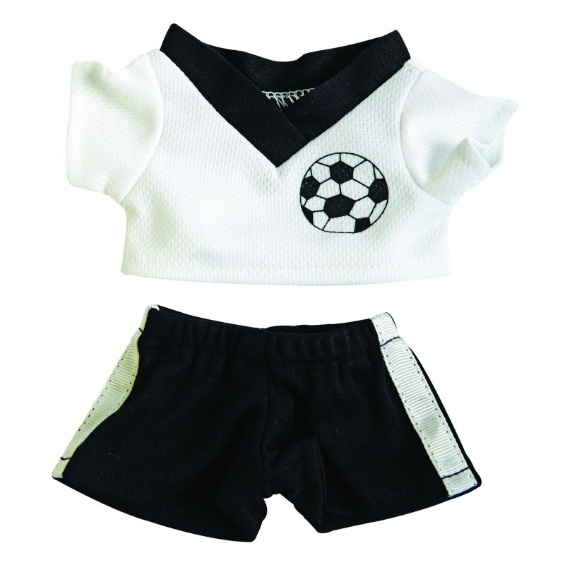 Werbeartikel Beschreibung: Fußball-Dress Gr. M, zum Anziehen von Plüschartikeln. Das richtige Outfit, um das eigene Team richtig anzufeuern und ihm so natürlich auch zum Sieg zu verhelfen: schwarze, kurze Shorts mit einem weißen Trikot mit Fußball-Aufdruck. So kann es ins Stadion gehen!