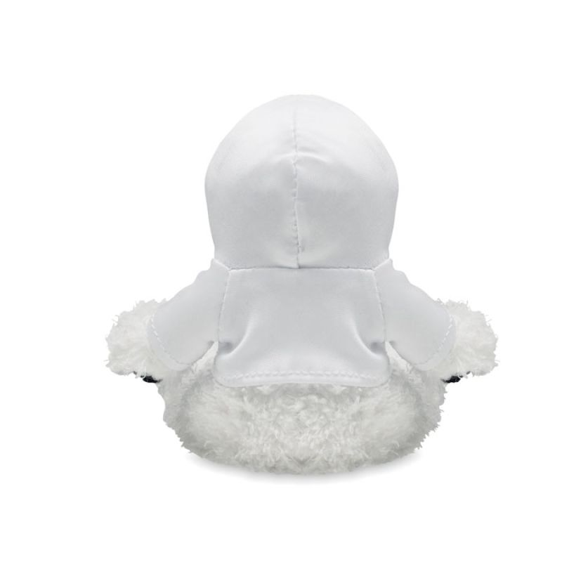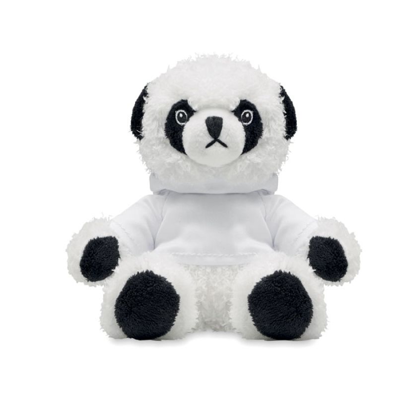 Werbeartikel Beschreibung: Panda-Bär aus Plüsch mit Kapuzenpulli. Ideal für Sublimationsdruck.