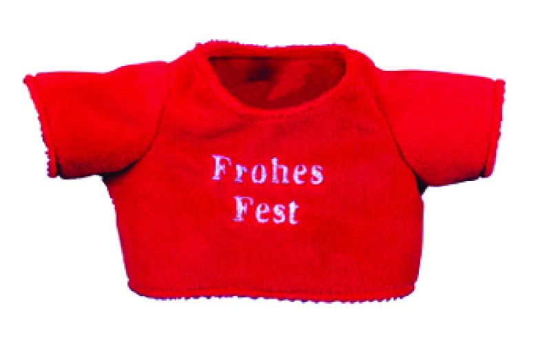 Werbeartikel Beschreibung: Weihnachts-T-Shirt "Frohes Fest" für Plüschtiere Gr. M, zum Anziehen von Plüschartikeln. Zwei große Vorteile haben unser Weihnachts-T-shirts: Zum einen halten sie durch ihr Material das Plüschtier auch zu dieser kalten Jahreszeit wunderbar warm und zum anderen bringen sie jeden Träger in Weihnachtsstimmung und jeder, der dann das besinnlich gestimmte Plüschtier erblickt, bekommt auch gleich festliche Laune. Weihnachtliches Rot zum Anziehen inklusive der Bestickung „Frohes Fest“ in weiß.