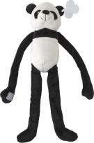 Plüschpanda mit langen Armen und Klettverschluss. Aufgestickte Augen. Inklusive Ohrmarke zum Bedrucken.