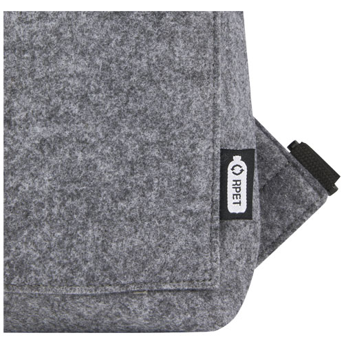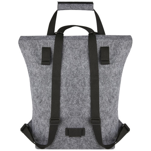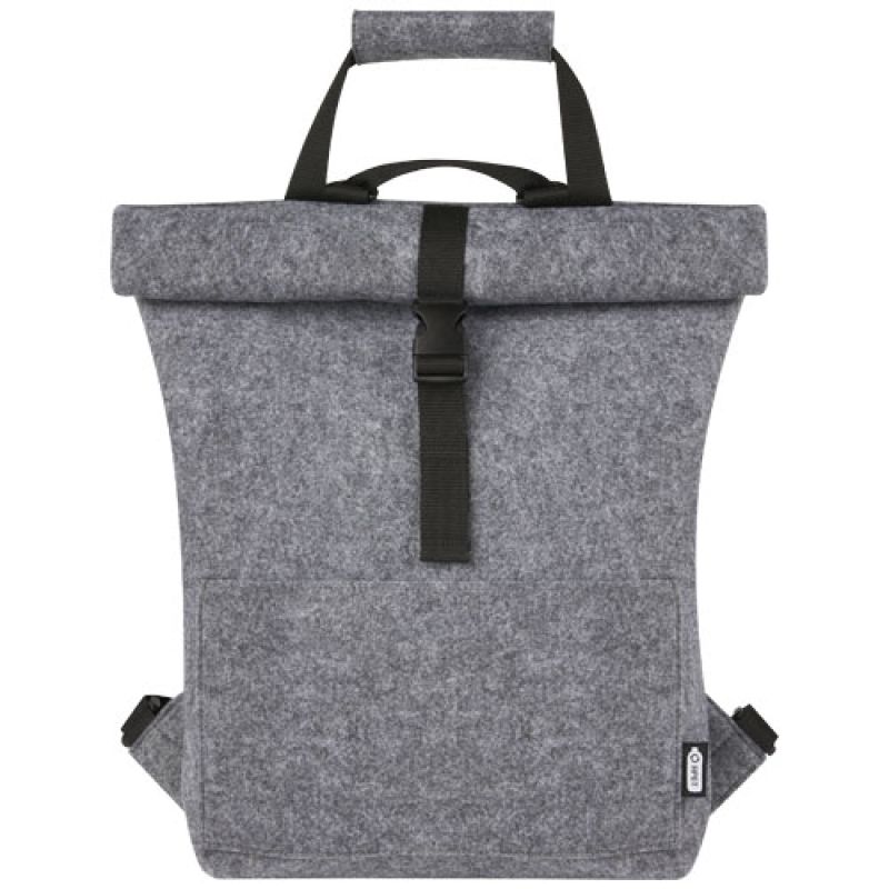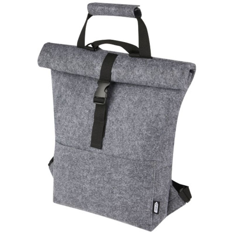 Werbeartikel Beschreibung: Multifunktionaler und modischer Rolltop-Rucksack und Fahrradtasche in einem. Aus hochwertigem, weichem und strapazierfähigem GRS-zertifiziertem, recyceltem Filz. Ausgestattet mit einem großen Hauptfach, einer Vordertasche, verstellbaren Schultergurten und 3 Klettverschlussgurten, mit denen die Tasche auf dem Gepäckträger eines Fahrrads befestigt werden kann. Die Schultergurte lassen sich leicht in ein langes Tragegriffsystem umwandeln oder so bündeln, dass sich die Gurte nicht in einem Fahrradrad verfangen können.