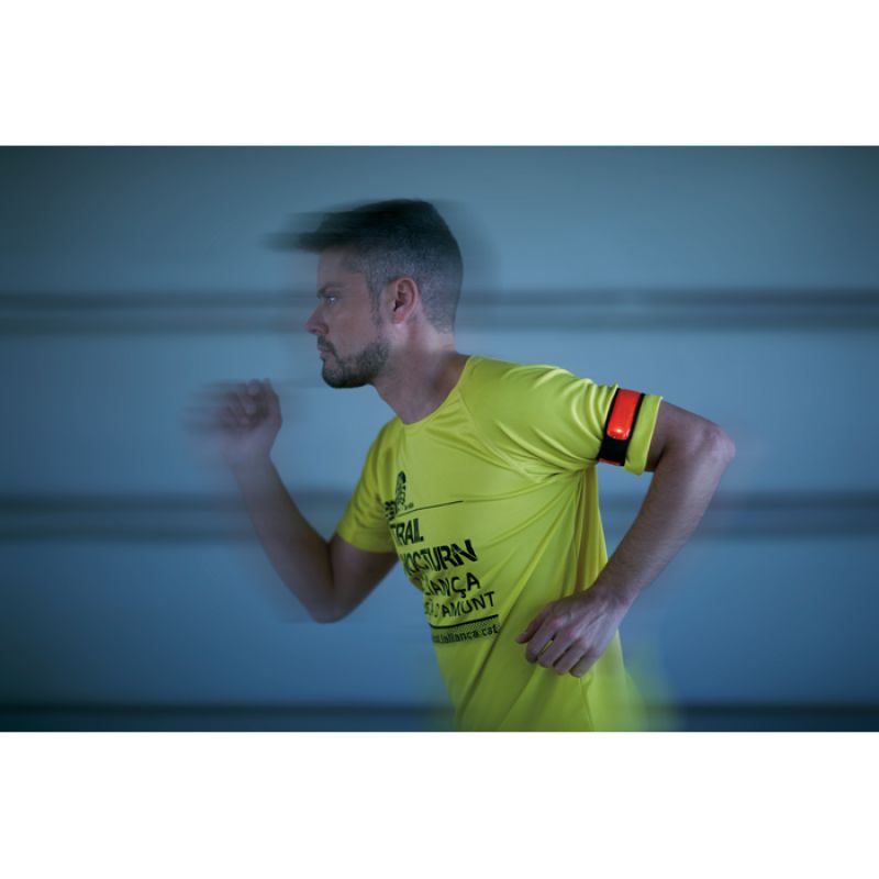Werbeartikel Beschreibung: Reflektierender Gurt für den Arm. 2 LED-Lichter mit 2 unterschiedlich einstellbaren Lichtsignalen. PVC mit Non Woven auf der Innenseite. Inklusive 1 CR2032 Batterie.