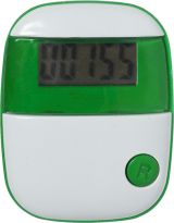 Pedometer aus Kunststoff mit Befestigungsclip und farbigen Applikationen.