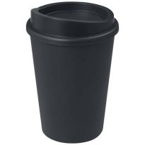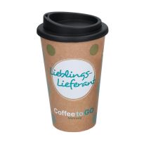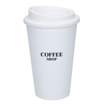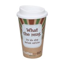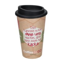 Für den Kaffee unterwegs. Praktischer To-Go-Becher aus doppelwandigem Kunststoff inkl. Deckel mit Trinköffnung. Der Deckel ist verschraubbar und hält somit besonders gut auf dem Becher. Füllmenge: 0,35 Liter.