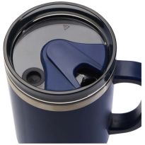 Einwandiger Trinkbecher aus Edelstahl mit Griffteil und Deckel aus Silikon. Füllmenge: 350 ml. Da der einwandige Becher die Hitze nach Außen leiten kann, kann der Artikel heiß werden.
