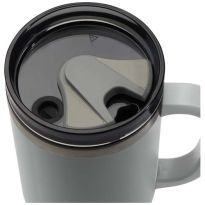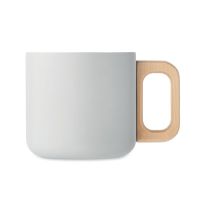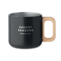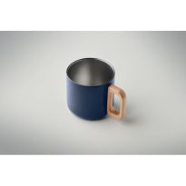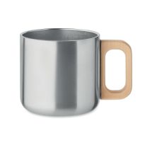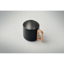 Doppelwandiger Becher aus recyceltem Edelstahl (90 % recycelter Edelstahl und 10 % Edelstahl). Griff aus Holz. Füllmenge: 350 ml.