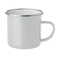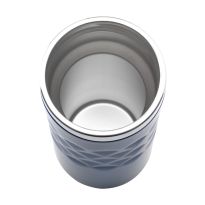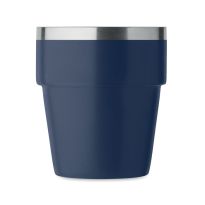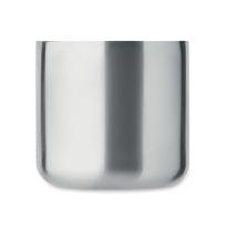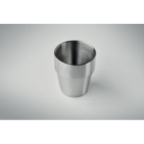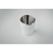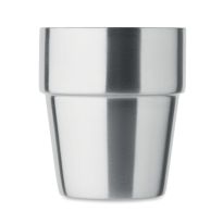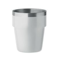 Becher aus Edelstahl mit gebürsteter, polierter Innenseite. Die Außenseite ist farbig pulverbeschichtet. Sauber verarbeitet. Fassungsvermögen 400 ml. Wird einzeln in einem Kraftkarton geliefert.